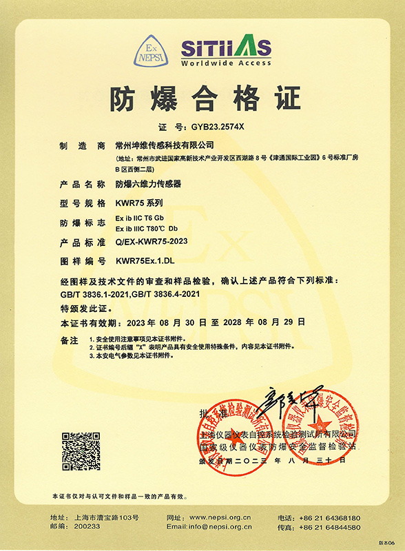 KWR75Ex系列防爆六轴力传感器采用高强度硬铝合金材质,内置高精度嵌入式智能电路,提供多种量程版本精准匹配不同需求。通过六轴联合标定技术实现高精度测量,支持全协议工业通信。